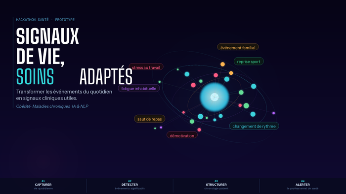 Les patients atteints de maladies chroniques vivent des événements du quotidien (stress, changements d’habitudes, ruptures de routine) qui influencent fortement l’évolution de leur état de santé, mais ces signaux restent souvent invisibles pour les professionnels de santé. Notre projet vise à détecter automatiquement ces événements à partir d’informations issues de la vie quotidienne des patients. L’objectif est de transformer ces informations en signaux utiles pour mieux comprendre les ruptures dans le parcours de soin et améliorer la prise en charge.