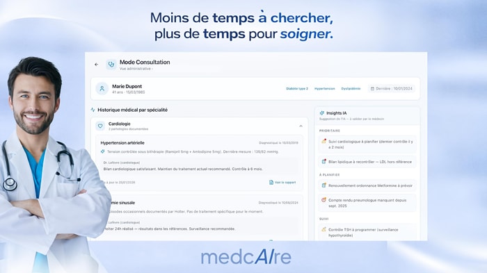 medcAIre est un assistant basé sur l’intelligence artificielle qui s’intègre aux outils existants et centralise automatiquement les informations essentielles du patient sur une plateforme unique, accessible en version web et mobile.
